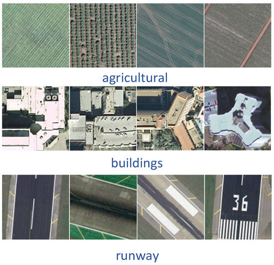 - The UC Merced [39] dataset was proposed by researchers at the University of California, Merced, in 2010 and contains 21 scene categories. Each scene category has 100 images with a region of 256 × 256 pixels, where each pixel has a spatial resolution of 0.3 m. The 2100 images were collected from a variety of regions, including Los Angeles, Houston, and Miami, and cover a wide range of land-use types in the U.S. region. The vast majority of land use remote sensing classification experiments use the UC Merced dataset for data comparison, and again, it was one of the first datasets to be proposed. Most of the experiments divide the UC Merced dataset into an 80:20 or 50:50 ratio between training and test sets for algorithm evaluation (Figure 11).