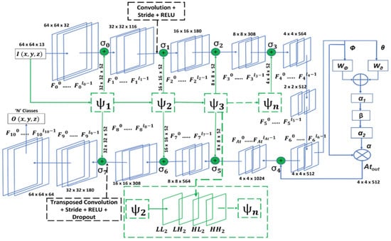 For complex scenarios, Khan et al. [53] proposed a multi-branch framework consisting of two deep learning networks, DenseNet [22] and FCN. The DenseNet network is used to extract the contextual features of the input image, and FCN is used to extract the local features of the input image. Finally, the features extracted by the two deep learning networks are fused and optimized with loss function. The network framework achieves the highest OA of 99.52%, 96.37%, and 94.75% on the UC Merced [39], Siri-WHU [54], and EuroSAT [42] datasets. Compared to methods such as GoogleNet, ResNet-50, MOEA, and ResNet-101, the authors’ method achieves higher accuracy and superior performance. Xia et al. [55] proposed a deep learning model based on unsupervised domain adaptation (UDA), which is capable of adapting to large-scale land cover mapping. Specifically, it solves the deep convolutional neural network (DCNN) biased mislabeling problem by using Siamese networks [56], and combines dynamic pseudo-label assignment and class balancing strategies, thus realizing adaptive domain joint learning. The authors compared their method with several UDA methods applicable to large-scale cities, such as AdaptSeg [57], AdvEnt [58], CLAN [59], and FADA [60], and after incorporating dynamic pseudo-label assignments, respectively, their method achieves the highest OA under sparse samples with 81.14%, 51.20%, 40.81%, and 40.81% of the OA, mF1, and MIOU. The highest OA, mF1, and MIOU of 80.85%, 55.33, and 43.99 were achieved with dense samples. Wang [61] and his team focused on research on crop classification, and they found that the existing crop classification methods could not be applied to multi-scenario challenges, so they proposed a deep learning method called Cropformer, which is based on a new type of transformer and combines it with convolutional neural networks. The method differs from existing crop classification methods in that it accomplishes both global and local feature extraction. The research team utilized Cropformer for grouping crop experiments in multiple scenarios. Experimental results show that Cropformer is more accurate and efficient than existing crop classification methods. It can extract additional information from unlabeled data to build up a priori knowledge for later crop classification. This a priori knowledge makes Cropformer better at handling the task of feature classification and more widely applicable. Singh et al. [62] developed an attention-based convolutional neural network (WIANet) architecture (see Figure 16) that overcomes the lack of spectral context modeling in CNNs when processing multispectral images. The authors introduced the Wavelet Transform (WT) [63], as well as an attention mechanism to the U-Net-based architecture to improve the network’s ability to discriminate spectral features, with the aim of more accurately distinguishing between classes whose spectral features have a high degree of similarity. Their methods achieved 92.43%, 91.80%, and 84.69% OA on the EuroSAT [42], NaSC-TG2 [64], and PatternNet [65] datasets, respectively, and achieved F1 on the EuroSAT dataset, which is higher than methods such as EfficientNet-B1 [66], RegNetX120 [67], RegNetY120 [67], and others.