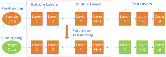 Transfer learning (TL) is the application of knowledge learned in the old domain (source domain) to the new domain (target domain), which compensates for the negative impact of sample scarcity and improves the generalization ability of the model, leading to more accurate classification. Therefore, TL is often used to deal with LULC under limited samples. Domain adaptation (DA), as a subfield in TL, is even more favored by researchers because it can solve the discrepancy problem between the source and target domains. Liu et al. [85] proposed a DA-based SFnet-DA network to solve the problem of insufficient labeled samples in practical applications. Specifically, an adversarial training consisting of domain classifiers and feature extractors was designed so that the parameters obtained from training the labeled dataset can be directly used for the prediction of unlabeled images. SFnet-DA achieves 97.13% F1 on the WHDLD dataset, which is higher and faster to process than excellent semantic segmentation networks such as U-Net and Deeplab V3+. Traditional DA methods make it difficult to balance the critical classes in the target domain, which may result in some classes in the target domain lacking labeled samples for training, so an unsupervised DA method was proposed by Soto et al. [86]. Specifically, a pseudo-label generation scheme called CVA was designed, with which the feature alignment of the target and source domains is balanced to avoid over-biasing to one category. Bai et al. [87] proposed a novel model that enables DA to directly align features in the source and target domains, which contains two DA branches and a semantic segmentation network. The two DA branches, one for adapting the representation space and one for adapting the prediction results, create feedback on each other to obtain more accurate classification results. Figure 18 illustrates the transfer learning.