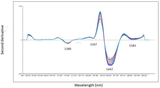 The second derivative of the NIR spectra of both unadulterated commercial whisky and adulterated mixture samples analyzed using the droplet collar accessory is shown in Figure 2. The second derivative spectra of the samples showed four distinctive absorption bands around 1180 nm associated with O-H stretch second overtone (water and alcohol), around 1347 nm with CH3 corresponding with the occurrence of aromatic groups, around 1447 nm with O-H stretch first overtone (water and alcohol) and around 1583 nm associated with the O-H stretch bands of water, alcohol as well as phenolic compounds present in the whisky samples [,,,,,,,,,,]. The absorbance band around 1447 nm is also called the dehydration band as reported by other authors [,,]. Specifically, it has been reported that the absorbance value at this specific wavelength can be used to measure low concentrations of methanol in water-methanol mixtures [,,]. However, in this study, slight changes in the absorbance values at 1447 nm were observed as the increase in the concentration of methanol from 0.5% to 5% in the unadulterated and adulterated whiskey samples analyzed.