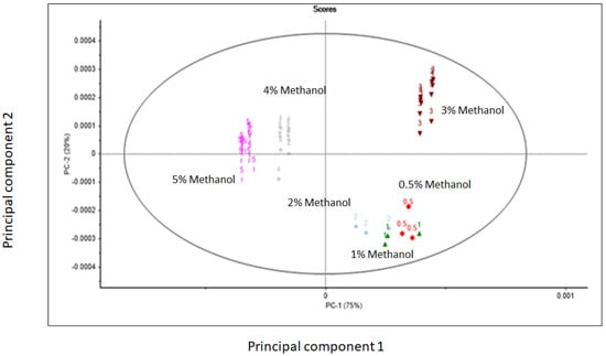 The NIR data were exported in Excel format (*.xls) into The Unscrambler software (version X, CAMO, Oslo, Norway) for data analysis and spectra pre-processing. The NIR spectra were pre-processed using the Savitzky–Golay second derivative (21 smoothing points and second polynomial order) prior to spectra interpretation and chemometric analysis []. Principal component analysis (PCA) was used to analyze the data and visualize the effect of the addition of methanol into the unadulterated whisky samples. Leave-one-out cross-validation was applied during the PCA analysis. Partial least squares (PLS) regression models were developed using the levels of methanol adulteration defined in the section above with the NIR region (950 to 1600 nm). In this study, the dataset was divided into two subsets namely calibration and validation, using the Kennard–Stone algorithm []. Uniformly distributed 150 samples were selected and used to develop the calibration models, where 66 samples were used for validation. By performing the data partitioning using the Kennard–Stone algorithm, knowledge of the training dataset did not affect the test dataset, and the predictive power of the created model subsequently increased []. The coefficient of determination in cross-validation (R2CV), the standard error in cross-validation (SECV), the standard error in prediction (SEP), bias, slope and residual predictive deviation (RPD = standard deviation / SEP) were used to evaluate the PLS cross-validation models obtained for the prediction of the level of methanol adulteration in the commercial whisky samples analyzed [,,].