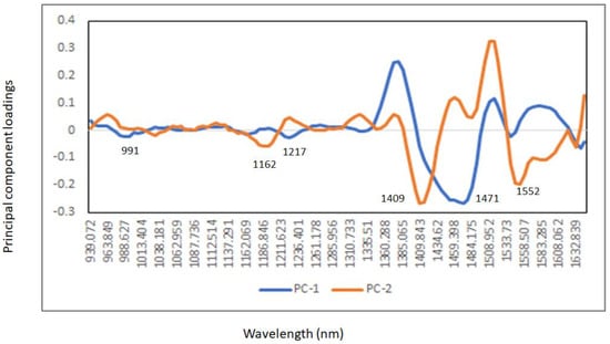 Principal component loadings used by the principal component analysis to evaluate the addition of methanol in the unadulterated commercial whisky samples and analyzed using the droplet collar attached to a portable near infrared instrument.