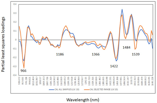 The optimal PLS loadings (10 latent variables) for the cross-validation models were interpreted and reported in Figure 5. Most of the wavelengths used by the PLS models were similar between both models (all samples and samples without including the low concentrations of methanol). The highest PLS loadings in both models were observed around 966 nm, 1186 nm, 1366 nm, 1422 nm, 1484 nm and 1539 nm associated with the same wavelengths and compounds assigned and described in the previous section [,,,,]. Additionally, shifts were observed in the loadings at wavelengths around 1422 nm, 1484 nm and 1539 nm due to the addition of methanol (O-H bonds) to the unadulterated whisky samples [,,,,].