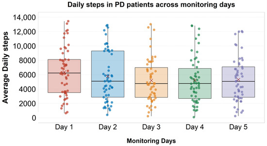 Boxplots showing daily steps for each monitoring day in PD patients. Thick line in the boxes indicates the median; lower and upper box limits indicate first (Q1) and third quartile (Q3), respectively; black vertical lines indicate lower and upper outliers boundaries calculated as Q1 − (1.5 × IQR) and Q3 + (1.5 × IQR), respectively. Red X indicates mean values for each disease stage. PD: Parkinson’s disease.