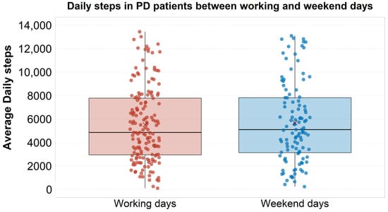The Mann–Whitney test showed no significant difference between the working days and weekend days for daily steps (W = 9051.52; p = 0.774) (Figure 2).