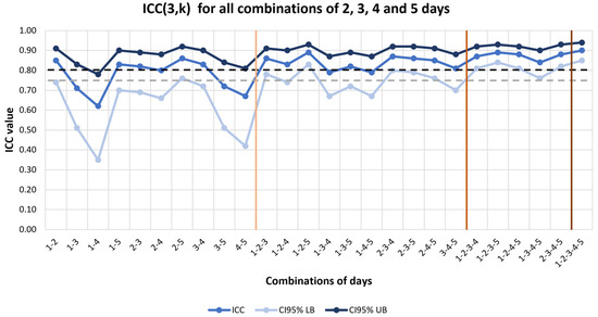 Graph showing the ICC(3,k) values across the different combinations of monitoring days. The top dark blue line represents 95% CI upper bound. The middle blue line represents the ICC (3,k) point estimate. The bottom light blue line represents 95% CI lower bound. Vertical brown lines were added to mark 2-day, 3-day, 4, day, and 5-day combinations. Dashed horizontal dark and light grey lines were added to mark the 0.8 threshold for the point estimate and the 0.75 threshold for 95% CI lower bound, respectively. CI: confidence interval; ICC: intraclass correlation coefficient. LB: lower bound; UB: upper bound.