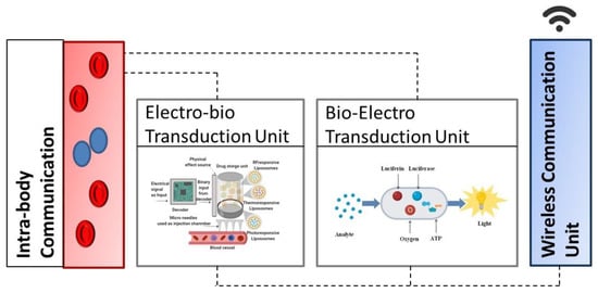 Bio–cyber interface is a hybrid device capable of transducing in-body biochemical signals into electromagnetic signals and vice-versa. Several modalities can be used for transduction between biochemical and electromagnetic signals such as bioFET-based molecular antenna [], reduction-oxidation (Redox) modality [,], and other interfaces offering biologically inspired capabilities like thermo-responsiveness and photo-responsiveness []. The choice of interfacing modality depends upon the assigned application requirements and propagation channel []. In this work, we have considered the bioluminescence-based biocyber interface model proposed by Chude-Okonkwo et al. [] based on biologically inspired properties such as biocompatibility, biodegradability, and non-toxicity. The bioluminescent biocyber interface (BBI) provides a practical opportunity for healthcare professionals to connect the Internet to in-body (in vivo) bio nanonetworks and studies in the domain are maturing to prototype evaluations []. We present a sample architecture and bio-cyber interface model illustrated in Figure 2. The bio-cyber interface utilizes thermal and light responsiveness to certain biomolecules producing information signals (biochemical reactions) propagated using the blood vessel network to an in vivo nanonetwork location for targeted drug delivery. The architecture of the bio–cyber interface includes two units: an electro-bio transduction unit and a bio-electro transduction unit. A detailed description of these units is given below.