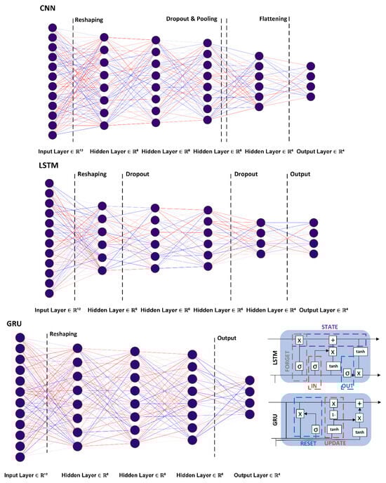 Recurrent model: RNN models incorporate interconnected neurons in each layer so that the output of preceding layers is taken into consideration while computing the input to subsequent layers. Stateful structure and feedback mechanism allow RNN to understand temporal characteristics for anomaly detection []. RNN however, suffers from the vanishing gradient problem, and therefore, practical applicability on larger data series may require the use of long-short term memory (LSTM) and gated recurrent unit (GRU) implementations. In the present study, we utilize LSTM and GRU models using similar network structures and operational values. Data is input to the first layer, succeeded by the dropout layer adding an element of uncertainty for better training. Models and the individual cell structures are illustrated in Figure 5. Fewer neurons in hidden layers are used in LSTM (36) compared to GRU (64) in the hidden layers, as the former requires a greater number of training parameters and results in higher training latency. The dense layer is the final processing primitive in either model. The sigmoid activation is used in GRU and LSTM for filtering and output is sent using a tangential function (TanH) []. The LSTM and GRU operations are represented by (10)–(13) and (14)–(16) respectively.
