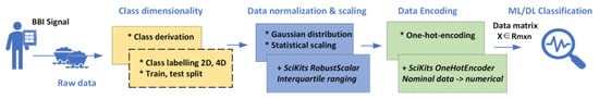 The primary steps involved in data processing involve class derivation and labeling, value normalization, and encoding for improved model fitting. An illustration of the main steps is illustrated in Figure 6, and these are discussed in detail as follows.