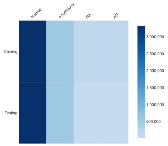 Step 1: Class-derivation and labelling: In total 7,985,539 records each having twelve feature values were generated using the bioluminescence parameters given by (1)–(8), and equally split for training and testing summarized earlier in Table 2. As per existing literature, out-of-bound variation in a minimum of three out of twelve (or greater) parameters of any given input vector constitutes an anomaly [,,,,]. Therefore, in two-dimensional (2D) class distribution abnormal parameters constituting more than ~25% of an input vector result in final class derivation being anomalous, and otherwise normal. Using 2D binary distribution, 6,866,701 samples represent normal and 1,117,829 anomalous vectors, indicating an overall ~86:14 probability split between normal and anomalous data as given in Table 3. However, having uniform 2D class labeling does not completely account for the scarcity of instances where normal in vivo channel communication presents realistic outliers, and the resulting operation is not necessarily anomalous due to realistic variations in molecular traffic [,,,]. In 4D classification, the normal-anomalous (NA) class realizes the normal operation even though the threshold parameter varies outside the threshold; and the anomalous-normal (AN) class represents abnormal operation despite parameters ranging within the stipulated threshold. NA and AN vector instances constitute ~3.4–3.9% of normal and anomalous vectors based on existing studies [,,,]. The resulting data is stored in matrix X ∈ Rmxn where m represents the number of samples and n is the number of variables (twelve). Vector L ∈ Rmx1 provides a class label (string).