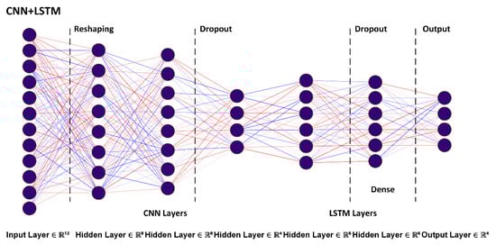 Dropout layers: dropout layers are used in fully connected layers, to address scholastic regularization and to limit model overfitting. Dropout layers are included at the end of CNN layers, and after LSTM input add an element of uncertainty for improved model training. The present implementation used a typical dropout value of 0.5, to regularize model over-fitting and minimize weight learning in each iteration [,].