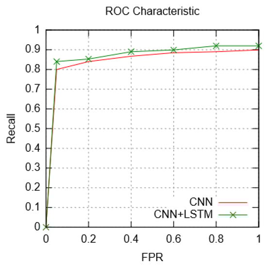 To compute the overall loss function, signifying a reduction in training phase, categorical cross entropy from Keras was used []. The receiver operating characteristic (ROC) curve for the optimal classifier in comparison with CNN is given in Figure 10. The resulting differences between the two models are subtle at certain thresholds. Although the overall difference in recorded metrics for the CNN, and CNN + LSTM model was minimal, the LSTM layer in the latter provides the additional benefit of extracting temporal correlations present in the in vivo traffic diffusion parameters such as the cumulative concentration rate released molecules (Ψ0), the diffusion rate of molecules (m0), and the drug delivery release rate (λ). Compared to ML, and DL models for generic and IoBNT-interface-specific anomaly detection classifiers in [,,,,,,,,], the optimal hybrid model can classify anomalous parameter traffic by dynamically reducing feature dimensionality which would be manually intensive if using traditional ML. Summarization of key differences and advantages of the proposed hybrid model over complimentary schemes are detailed in Table 7. Zafar et al. [] provided an authentication method for IoBNT interfaces employing channel impulse response (CIR) profiling to isolate anomalous control signals. El-fatyany et al. [] relied on binary-phase-shift-keying (BPSK) modulation to encryption system-IoBNT communication keys. These early non-ML reliant schemes allowed limited toleration for noisy signals affecting in-vivo TDD, while also being computationally intensive due to inherent multi-stage encryptions. Among ML/DL classification use-cases in IoT, and IoBNT domain, the primary constraint has been manual or multi-stage feature engineering as is the case in [,,,,,,], as well as limited dataset diversity as in []. In the IoT domain, utilize semi-hybrid classification strategies to detect network anomalies. Classifiers proposed by Abusitta et al. [], Rosero-M et al. [], Chander et al. [], and Hameed et al. [], rely on either extensive unsupervised ML-based feature engineering followed by neural network training (semi-hybrid models), use multi-stage process(es), or allow only binary traffic classification, limiting practical realization of these classifiers in IoBNT-specific interfacing for timely anomaly detection. The present hybrid (CNN + LSTM) model, in contrast, allows for automated feature processing and selection using a neural network structure. Extensive multi-stage feature engineering prior to DL application results in significant computational overhead which would be counter-intuitive for deployment in IDS, and IPS if re-training were required. Furthermore, supervised feature selection represented in prior schemes necessitates a new cycle of data collection, annotation, and training for updating classifiers [,,,,,]. However, such a training primitive is not applicable for the proposed hybrid since the addition of new data would only require preparation (pre-processing), with convolutional layers performing necessary feature selection. The operational considerations and performance challenges of the proposed model are considered in the following sub-section.