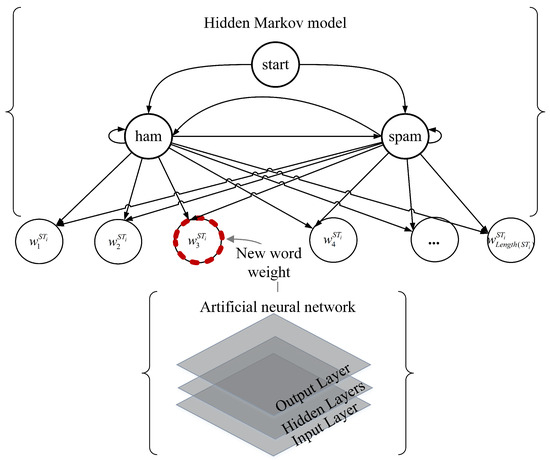 The schematic diagram of the proposed model is shown in Figure 2, illustrating that the ANN and the HMM are used for new word weighting and spam filtering, respectively.