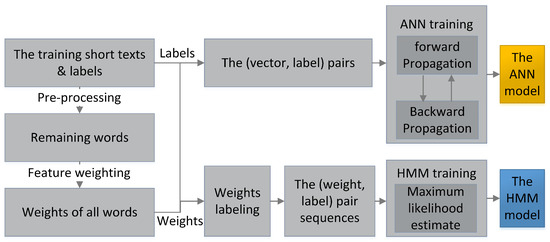 Figure 3 shows the training process of the hybrid model. When the training starts, the short texts in the training set are pre-processed. The remaining words are weighted to form the inputs: the pairs for the ANN and the pair sequences for the HMM. Then, the ANN is trained by the backward propagation algorithm. Meanwhile, pair sequences are joined into one sequence for the HMM batch learning based on the maximum likelihood estimate method.