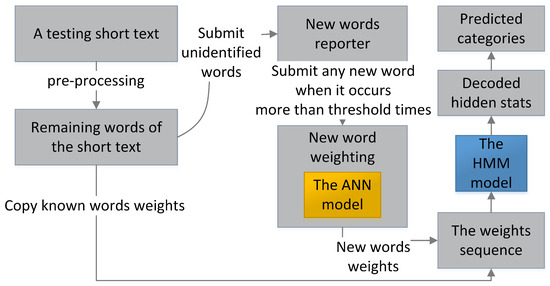 In step 1, suppose a new word existed in the q testing short texts, which are represented as the following vectors: . The short text vector consists of the weights of known words, represented as . The weight of a new word is absent because it is out of the vector space. The short text vector feeds the ANN to yield the probabilities and , respectively.