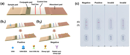 For small molecules like VAN, a competitive immunoassay is essential, as shown in Figure 1(b1,b2). The test line is coated with a competitive VAN–BSA antigen, and the control line is coated with an immunogold antibody. Upon application of the sample to the sample pad, the sample flows through the colloidal gold pad to interact with the gold-labeled antibodies. It then progresses through the test and control lines before being absorbed into the absorbent paper. The appearance of a visible line in the test area signifies a negative result for VAN (Figure 1(b1)). Conversely, the absence of a visible line suggests that a sufficient concentration of VAN is present, thereby occupying the antibody–gold nanoparticle binding sites and preventing them from binding to the VAN–BSA antigen, resulting in no visible line (Figure 1(b2)). Regardless of the presence or absence of VAN, a red control line should always appear when the test is operating correctly. Otherwise, the results are invalid. Figure 1c depicts the four scenarios that may arise during testing.