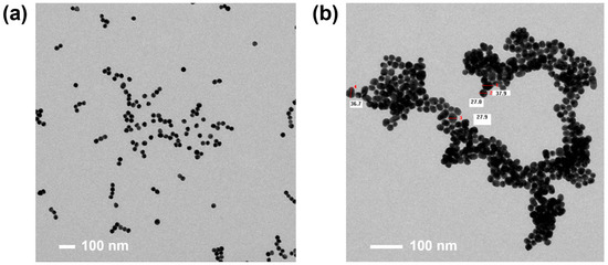 In the context of immunoassays, colloidal gold is frequently used to form complexes with immunologically reactive substances such as antigens or antibodies, collectively termed as immunogold complexes. The dimensional attributes and morphological characteristics of these complexes bear critical importance for the optimal performance of the assay. Figure 2a,b show the transmission electron microscopy images of high-quality and low-quality synthesized gold nanoparticles, respectively. The high-quality gold nanoparticles exhibit good monodispersity, centering around an average diameter of 31.2 nm with a standard deviation of ±3.3 nm. In contrast, the lower-quality gold nanoparticles show poor monodispersity with an average diameter of 28.7 nm and a standard deviation of ± 8.1 nm.