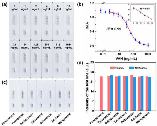 (a) Detection limit of colloidal gold test strips assessed by the naked eye. (b) A typical calibration curve illustrated by plotting (B/B0) against VAN concentration; the data are displayed as mean ± standard deviation, n = 3. The fitting equation is y = 0.01697 + 0.93724/(1 + (x/43.46265)1.51219), with a correlation coefficient (R2) of 0.99. The top-right inset illustrates the linear portion of calibration curve. The fitting equation is y = 1.5401 − 0.62778 × log10(x), with a correlation coefficient (R2) of 0.98. (c,d) Cross-reactivity of the test strip with other antibiotics, including teicoplanin, dalbavancin, telavancin, oritavancin, amikacin, and meropenem.