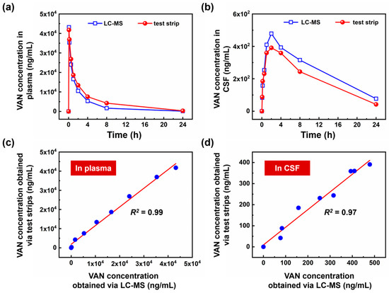 Pharmacokinetic study of vancomycin in beagle dogs over a 24 h period following a 12 mg/kg intravenous injection: (a) in plasma and (b) in CSF. The blue line represents the results obtained via LC–MS, while the red line indicates the results obtained via the test strip assay. Each data point represents the average VAN concentration of three beagle dogs. The relationship between VAN concentrations obtained from LC-MS and test strips is as follows: (c) in plasma, the equation is y = 0.9744x + 1841, with a correlation coefficient (R2) of 0.99, (d) in CSF, the equation is y = 0.8381x + 9.1603, with a correlation coefficient (R2) of 0.97.