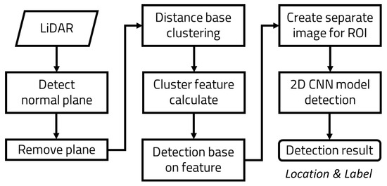 It performs preprocessing to perform clustering of point cloud data collected and transmitted by LiDAR sensors. First, it removes ground data that interferes with clustering. This process consists of searching for and removing removable ground within the data. It finds points inside the point cloud that constitute a removable-sized ground surface. Then, it finds and removes the data that it detected. This process is performed iteratively until there are no more removable-sized grounds that have been removed. After the ground data are removed, the point cloud data are clustered based on the distance data of each point. This separates the point cloud data of objects into groups of individual objects. From the points in these object groups, we extract the preset physical attribute values for classification. The extracted physical attributes are fed into a pre-trained classification model using machine learning. From the input attributes, we obtain a probability value that predicts what kind of object the object is. This probability value is used to semantically label the objects in the data in the first place. Obtain the location coordinates and area of labeled objects in the 3D region that have a high probability of being the target of the search. Convert the object locations in the 3D region to 2D image regions. Generate new 2D frames with the converted 2D regions and synthesize them with the 2D images to create ROI images. The generated image is then passed to the 2D-based CNN object detection algorithm. After receiving the 2D frame, the object detection algorithm performs object detection on the image in the area inside the frame to finally determine which objects are inside the frame. As a result, the location of the detected object inside the image and the label of the object can be obtained. See Algorithm 1.