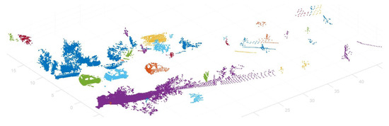 Each point in point cloud data has a 3D coordinate value. In LiDAR data, the origin of the point cloud data are the location of the sensor, so the distance between each point and the sensor can be calculated as the sum of the squares of each coordinate value. Since the point data that make up an object are points of the same object, their distance values from the sensor are similar [17]. Therefore, clustering is performed to group points with similar values using the coordinate data of each point and the distance data from the sensor (Figure 9).