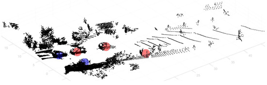 Result of a semantic classification process on point cloud data—the red regions are predicted target objects with a high probability, and the blue regions have a relatively low probability.