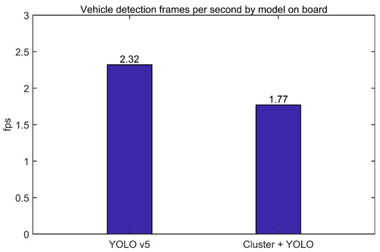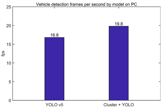 To check the performance difference according to the processor, we measured the processing time of the two models in the PC environment (Figure 17). We performed the experiment without a GPU in an Ubuntu 18.04 PC environment with 8 GB ram on an AMD Ryzen 54500U processor. Because we used the same detection model, there was no significant difference in accuracy performance. First, for YOLO v5, a 2D based image detection algorithm that performed the proposed clustering, we processed 16.8 fps and 19.8 fps for the proposed model, including clustering. Unlike the embedded model, the processing speed of the proposed model increased by about 17.8%. This is because the reduced processing time on the PC due to the omission of region exploration and the reduced image size to be explored is greater than the added processing time during the clustering process. Therefore, the proposed model shows different time performance trends depending on how long a particular process handles the clustering process and how long a particular region of the 2D detection model is performed.