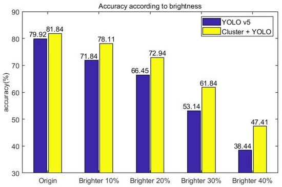Figure 15 is the result of vehicle detection accuracy for image data modified to assume over-exposure situations, which increased the brightness of the original data and image data of the two models’ KITTI sets. In the original data, the only-YOLO-v5 model had an accuracy of 79.92%, and the proposed model had an accuracy of 81.84%, which was 1.92% higher than the only-YOLO-v5 model. As the brightness of the image data increased, the accuracy of the two models decreased. The only-YOLO-v5 model showed a 41.48% decrease in accuracy to 38.44% when the brightness was increased by 40% from the original image accuracy of 79.92%. The proposed model showed a 34.53% decrease in accuracy to 47.41% when the brightness was increased by 40% from the original image accuracy of 81.84%. When the brightness of the image was increased by 40%, the proposed model showed 8.97% higher accuracy than the only-YOLO-v5 model. In brightness environments above 40%, neither model showed significant recognition results, so we only set the target brightness up to 40% in this experiment.