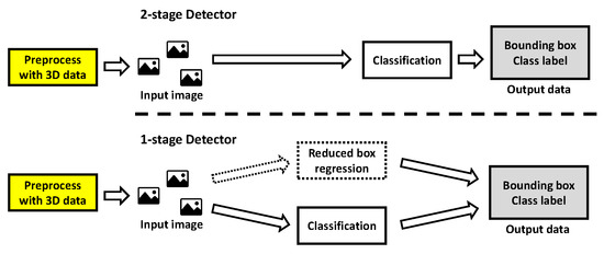 The 2D-image-based CNN detector was largely divided into two types of structures as shown in Figure 18. The two-stage detector goes through a region proposal process to find an area that is presumed to be the object to be searched in the input image, and then it performs a classification process to distinguish the type of object in the area and to obtain the final object detection result. The one-stage detector processes two simultaneously performed processes on the two-stage detector in parallel to obtain the final detection result. Yolo v5, the model used in the paper, is a one-stage detector.