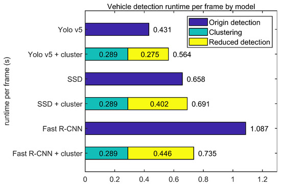 Figure 20 shows the processing time per frame of the model using the three 2D image detector models and the proposed method, respectively. In an embedded board, the clustering and preprocessing process of the image took 0.289 s per frame. Each model was post-processed by a reduced model with a region proposal process omitted, where Yolo v5 reduced by about 36.2%, SSD reduced by about 38.9%, and Fast R-CNN reduced by about 58.9%. The resulting total execution time increased by about 30.8% for Yolo v5 and 38.9% for SSD, but decreased by about 32.3% for Fast R-CNN. For the one-stage detectors, Yolo v5 and SSD, the detector’s runtime reduction was about 37%, which was small compared to the added clustering load, resulting in an increase in total runtime. Conversely, Fast R-CNN, a two-stage detector, decreased the total runtime due to the large load reduction in the detector compared to the clustering load added with the detector’s runtime reduction of about 58.9%.