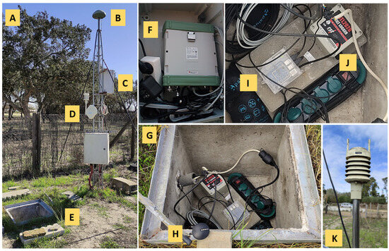 Instrumentation located in the Doñana National Park, Huelva, Spain: (A) the prototype seismogeodetic system, (B) metal tripod that supports the Leica Geodetic (AR10) antenna, Leica GNSS receiver, and weather sensor, (C) box containing the GNSS receiver and main communication switch, (D) Vaisala weather sensor (WXT520), (E) concrete chamber located 1m away from the tripod, (F) Leica GR30 GNSS receiver, (G) contents of the concrete chamber: Seismometer, Inclinometer, communications connectors, power supply connectors, and desiccant bags that prevent humidity, (H) GNSS receiver UBX–M8030, (I) Raspberry Shake 4D Seismometer/Accelerometer, (J) Biaxial Digital Tilt Logger DTL202B, and (K) Vaisala weather sensor, owned by AEMET.