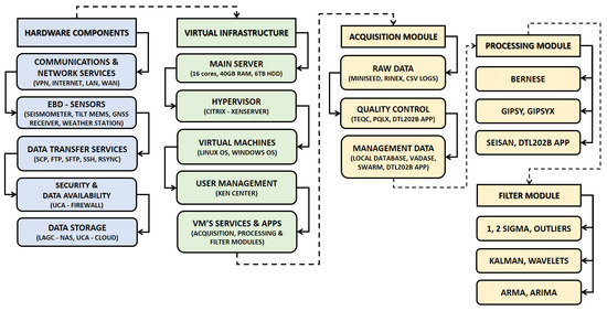 In this module, different mathematical and statistical techniques are applied for signal processing, correction of abnormal values, and reduction in the noise level of the time series obtained. For this purpose, data analysis and filtering techniques are used, methodologically grouped into Initial filters (1–, 2–, and outliers), Analytical filters (Kalman and Wavelets), and statistical filters (ARMA and ARIMA); this filtering software has been developed using the multiplatform and free-to-use statistical language R [22,23,24].