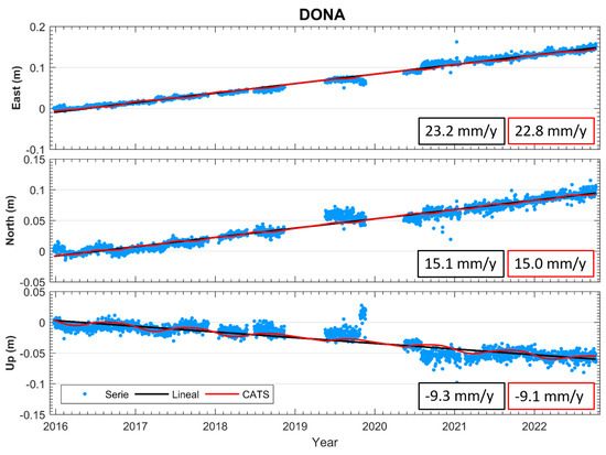 In Figure 4 and Figure 5, we show the time series analysis of cGNSS DONA station, which is a fundamental part of the prototype seismogeodetic system. The relative processing technique was used with the cGNSS reference stations VILL (Villafranca) and YEBE (Yebes) located in the province of Madrid, Spain; both stations belong to the international network IGS. GNSS processing was performed with the software BERNESE 5.2, using the ITRF14 reference frame; the years analyzed were from 2016 to 2022. The original time series show the deformation values: East = 23.2 mm/y, North = 15.1 mm/y, Up = −9.3 mm/y. Using the CATS filter, the deformation values are East = 22.8 mm/y, North = 15.0 mm/y, Up = −9.1 mm/y, (Figure 4).