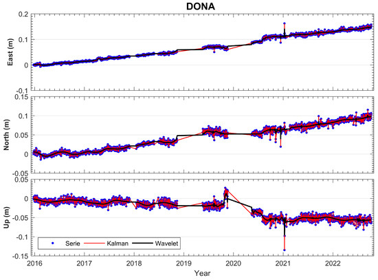 Results (E, N, U) of the DONA station time series; the GNSS processing was performed with the BERNESE 5.2 software using ITRF14. In addition, Kalman and Wavelets filters were applied.