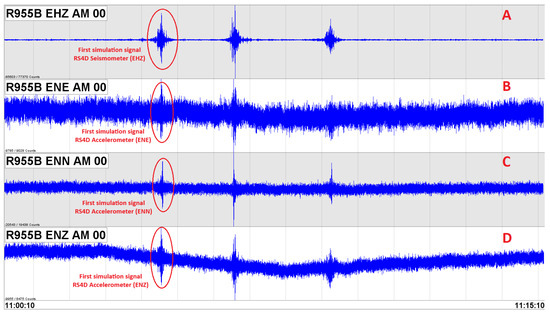 The seismic signals recorded by the RS4D seismometer/accelerometer are visualized using the software SEISAN 12.0, which has several subroutines and services used for analog and digital analysis of seismic recordings. The SEISAN software can locate a seismic event, determine the spectral parameters and azimuth of the arrival signal, and visualize and determine the epicenters and depth of the seismic event [31]. In Figure 6, a seismic signal is observed in real-time, the EHZ component corresponds to the vertical component of the seismometer, and the ENE, ENN, and ENZ components correspond to the accelerometer. In this image, a simple simulation of a seismic event is displayed in order to know the resolution of the sensor and check the quality of the generated data. The data acquisition system stores records in miniSEED format in a user-defined directory structure; these data are converted to a new multi-channel format containing three recording channels for the accelerometer and one recording channel for the seismograph in its vertical component. Later, these channels are stored in a database; these records consist of very small files (ASCII format), containing the information of the P (Primary) and S (Secondary) phases of an event, in addition to important parameters such as arrival times of the seismic wave, duration, amplitude, periodicity, azimuth, and apparent velocity.