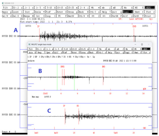 Seismic events display on SEISAN 12.0 software for seismic analysis. (A) Seismogram of the earthquake that occurred at 22:03:49 on 1 January 2022, recorded on Z channel of the RS4D seismometer with a filter of 2–15 Hz. (B) Unfiltered seismogram of the same event with the waves phases P and S, and coda selected. (C) Signal amplification, and impulsive arrival of the P-wave and arrival of the S-wave.