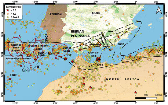 The south of the Iberian Península and North Africa region corresponds to the transition between the oceanic edge and the continental edge where the Iberian Peninsula and Africa meet in the direction of Tunisia, includes the Betic mountain ranges, the Gulf of Cadiz, the Alboran Sea, and the northern part of Morocco, characterized by a large complex of faults, giving rise to a complex tectonic evolution and moderate seismic activity as a consequence of the convergence process between the Eurasian and African plates. In the Alboran Sea region, north of Morocco and the southeastern peninsula, seismicity is diffuse, which makes it difficult to identify the plate boundary. Most of the seismic activity is concentrated in the shear zones of the Eastern Betic Shear Zone (EBSZ) and its prolongation in the Alboran Sea along the Trans-Alboran Shear Zone (TASZ) [32,33,34,35,36] (Figure 8).