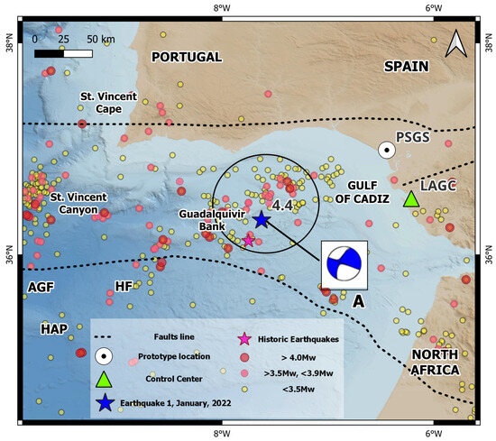 Map showing the location of the 4.4 Mw earthquake that occurred on 1 January 2022 in the Gulf of Cadiz (Lat: 36.3276, Lon: −7.6271, depth: 6 km) recorded by the RS4D seismometer/accelerometer. We also show seismic events of different magnitudes that occurred between 2005 and 2022 in the Gulf of Cadiz and adjacent areas (data taken from the public seismic catalog of IGN), the location of the Seismogeodesic System in the Doñana Biological Station, Huelva, Spain, the Control Center (LAGC–UCA), and the focal mechanism produced by the studied earthquake (A).