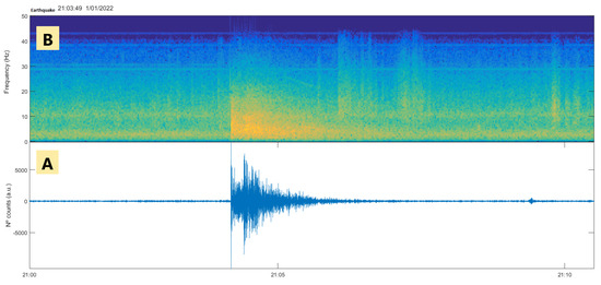 Seismogram (A) and spectrogram (B) of the earthquake that occurred on 1 January 2022 at 22:03:49 registered by the RS4D seismometer/accelerometer integrated in the prototype. In this seismic signal, a low signal-to-noise ratio was found in certain periods of time, which allowed the use of a first filter of 0.5 Hz to 10 Hz and a later one of 2 Hz to 8 Hz.