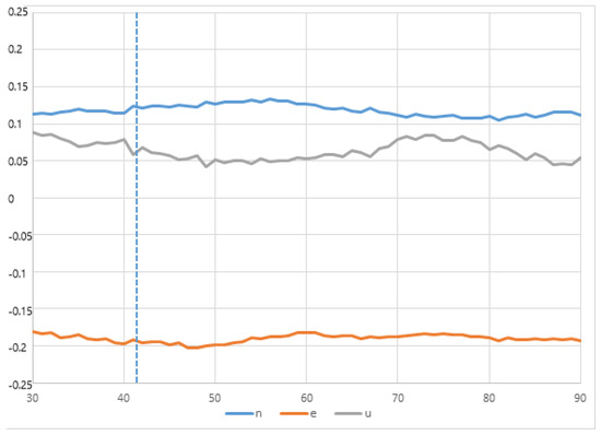Kinematic processing can be used on a static point, with high frequency sampling data collection, for instance, 1 Hz sampling. It is possible to take advantage of these results to show the motion of a point reached by the seismic waves of an earthquake produced in the location surroundings. In such a way, high-rate GNSS displacements are useful for monitoring long-period ground motion [28]. Point positioning evolution might complement seismometer records, i.e., when the seismic wave intensity produces seismic record saturation, hiding the local behavior. Furthermore, combinations of near-source GNSS and seismic record data provide a broad spectrum of co-seismic motion, including both high frequencies and long periods. Experimental results have shown that high-rate PPP can produce absolute horizontal displacement waveforms at the accuracy of 2–4 mm and absolute vertical displacement waveforms at the sub-centimeter level of accuracy within a short period of time [29].
