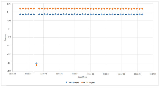 Inclinometry results (30 s sample rate) where the displacement produced in both sensors (Tilt 1, Tilt2) is observed and that corresponds to the arrival of the seismic wave of the 4.4 Mw earthquake that occurred on 1 January 2022 in the gulf of Cadiz.