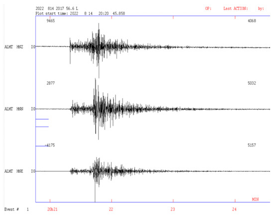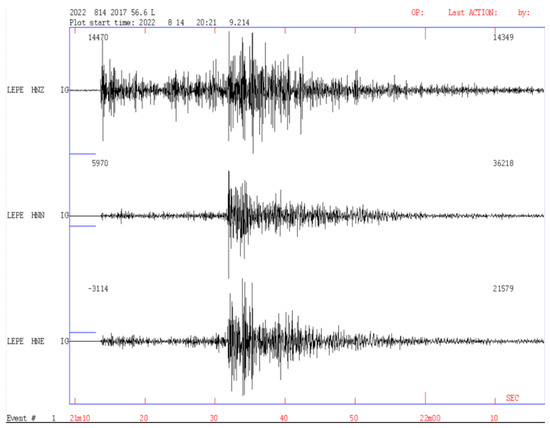 On the other hand, the Andalusian Institute of Geophysics of the University of Granada has installed a network of accelerometric equipment at various strategic points near the coast of the Gulf of Cadiz; this network helps to verify the results generated by the sensors of the prototype. Below, we show the accelerographic signal from the ALMT and LEPE sensors located in the municipalities of Almonte and Lepe in the province of Huelva, close to the Doñana Biological Station; these signals correspond to the 5.4 Mw seismic event that occurred on 14 August 2022 in the Gulf of Cadiz (Figure 13 and Figure 14).
