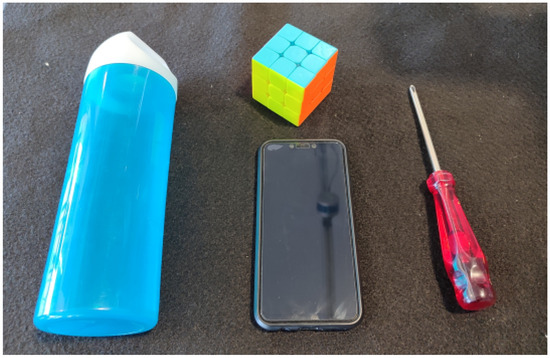 Figure 3. The objects used in the study include a water bottle, a Rubik’s cube, a smartphone and a screwdriver.