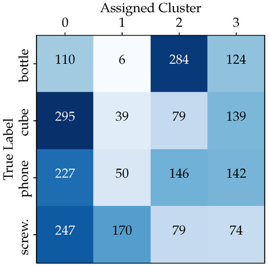 The analysis results are visualized in a 4 × 4 matrix, denoted as the “True Labels” vs. “Assigned Cluster” matrix (see Figure 5). This matrix provides a comprehensive view of the K-means clustering method’s performance in object recognition and it enables the computation of the proportion of objects assigned to each cluster. This cluster analysis provides valuable insights into the relationships between hand poses and class labels. First, the analysis of the relationship between clusters and class labels in hand pose data reveals that certain clusters, like Clusters 0 and 3, exhibit a diverse mix of all classes. Second, in the test data, Cluster 0 encompasses a substantial 39.8% of the samples. Third, and of utmost importance, the K-means clustering results indicate that the clusters do not closely align with the class labels, which may indeed present challenges for the chosen classifier.