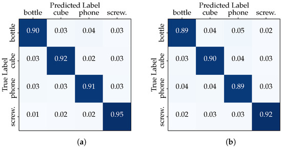 In order to investigate the influence of session-based testing, we divided the dataset into two configurations. In the first configuration, referred to as the “Full Dataset” scenario, we employed the entire dataset consisting of 11,054 samples for both training and testing. First, the dataset was randomly split into training (6632 samples), validation (2211 samples) and testing (2211 samples) subsets. This setup aims to evaluate the classifier’s performance when trained on a diverse set of hand–object interactions. Table 2 summarizes the results of evaluating the performance of the two models in the “Full Dataset” scenario in terms of accuracy, precision, recall and F1-score. The CNN and transformer show similar results with robust scores around 92%. The confusion matrices in Figure 6 show that the classifiers excel at distinguishing between the different classes, maintaining high accuracy.