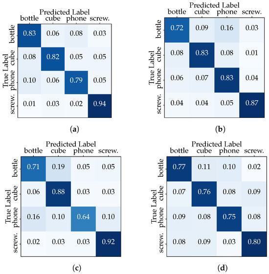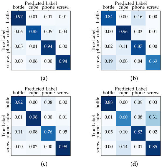 Confusion matrices are used to help identify specific areas where the model may excel or struggle in recognizing the grasped object. Additionally, metrics such as accuracy, precision, recall and F1-score are evaluated by computing the four counts that constitute a confusion matrix: the number of correctly predicted class examples (True Positives, T P ), the number of correctly predicted examples that do not belong to the class (True Negatives, T N ), and examples that either were incorrectly assigned to the class (False Positives, F P ) or that were not predicted as class examples (False Negatives, F N ).