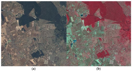 After processing the raw data, and considering the institution’s objectives, the images were organized in tiles of 10 km by 10 km. For each tile, two distinct types of products were composed using the four available bands: RGB and CIR (color infrared). RGB images depicted the natural scenery as perceived by the human eye, while CIR images, also called false colors, presented a stack of red, green, and near-infrared bands. The utilization of CIR images proves highly beneficial, as they offer precise and valuable information about the natural environment. For example, brighter infrared regions signify denser and healthier vegetation, while man-made objects are depicted using tones of blue or green.