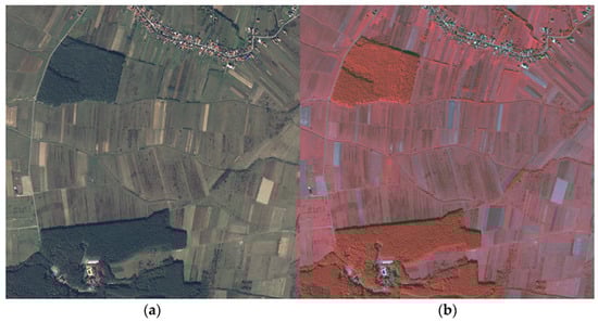 Samples of the aerial imagery. (a) RGB image; (b) CIR image.