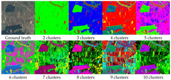The GMM algorithm was modified to search for two to ten clusters. In Figure 4, the clustering results are shown for each number of components, the first one being the ground truth. The colors representing each cluster were chosen randomly and eccentrically for a better visual experience. While the two-cluster segmentation was unable to properly identify the forest, the rest of the iterations had decent results. Unfortunately, starting with the 6th iteration, the results become granulated and the target classes were too mixed. In some areas, the forest was even represented in four distinct colors, which is far from reality.