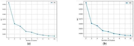 To further analyze the best scenario, the AIC [] and BIC [] scores were implemented. These two are widely employed criteria for model selection in clustering, aiding in identifying the optimal number of clusters within a dataset. Grounded in information theory principles, these criteria strike a balance between model fit and model complexity, facilitating the determination of the most suitable clustering solution. This solution is also proposed in [] where the appropriate GMM number of clusters was decided to identify the driving style of car drivers.